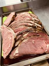 Smoked prime rib dinner with 3 or 6 sautéed garlic butter shrimp served with coleslaw and either mashed or baked potato.